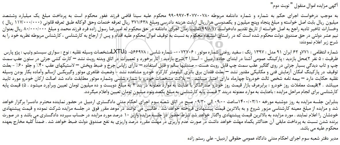 مشخصات وسیله نقلیه : نوع : سواری سیستم وتیپ : پژو پارس LXTU5 شماره انتظامی : 771و 62 ایران 91 مدل : 1397 رنگ : سفید روغنی شماره موتور : 0072706- شماره شاسی : 566978- ظرفیت : 5 نفر 2)محل بازدید : پارکینگ عمومی آشنا در ابتدای جاده اردبیل - آستارا 3)شرح بازدید : آثار برخورد و تعمیرات در اتاق وبدنه رویت نشد – کارت کشی جزئی در ستون عفب سمت چپ و تاب دیدگی بسیار جزئی در روی گلگیر عقب سمت چپ قابل رویت هست - صندلیها سالم و قابل استفاده – دارای زاپاس چرخ و ضبط وپخش – لاستیکهای عقب 40% و جلو 60% - بعلت توقیف در پارکینگ امکان آزمایش فنی و مکانیکی مقدور نشد – بعلت فقدان برق باتری کیلومتر کارکرد خودرو مشاهده نشد - وضعیت ظاهری موتور وگیربکس ازسالم وآماده بکار بودن وسیله نقلیه حکایت دارد – بیمه نامه شخص ثالث خودروتا چهارماه دارای اعتبار میباشد . – پلاکت مشخصات خودرو با شماره شاسی وشماره موتور مطابقت داده شد اصالت ارکان خودرو مورد تایید میباشد . 4)قیمت معاملات روز خودرو : برابرعرف بازار قیمت روز خودرو صدرالذکر با عنایت به موارد معنونه در بند 3 به مبلغ دویست و ده میلیون تومان تعیین وبرآورد میشود . 5) قیمت پایه کارشناسی برای انجام مراحل مزایده : باعنایت به موارد معنونه دربند 3 قیمت پایه کارشناسی به مبلغ یکصد ونود میلیون تومان تعیین واعلام میگردد.