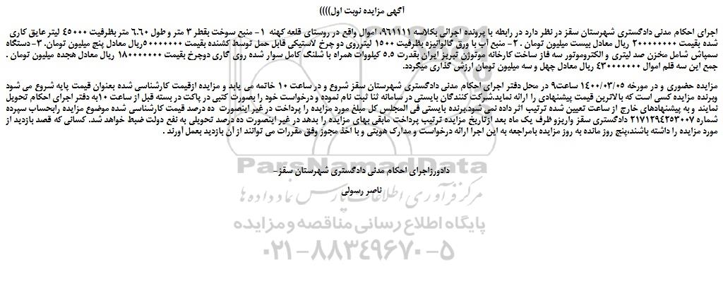 اجرای احکام مدنی دادگستری شهرستان سقز در نظر دارد در رابطه با پرونده اجرائی بکلاسه 961111، اموال واقع در روستای قلعه کهنه 1- منبع سوخت بقطر 3 متر و طول 6.60 متر بظرفیت 45000 لیتر عایق کاری شده بقیمت 200000000 ریال معادل بیست میلیون تومان . 2- منبع آب با ورق گالوانیزه بظرفیت 1500 لیترروی دو چرخ لاستیکی قابل حمل توسط کشنده بقیمت 50000000ریال معادل پنج میلیون تومان. 3- دستگاه سمپاش شامل مخزن صد لیتری و الکتروموتور سه فاز ساخت کارخانه موتوژن تبریز ایران بقدرت 5.5 کیلووات همراه با شلنگ کامل سوار شده روی گاری دوچرخ بقیمت 180000000 ریال معادل هجده میلیون تومان . جمع این سه قلم اموال 430000000 ریال معادل چهل و سه میلیون تومان ارزش گذاری میگردد.