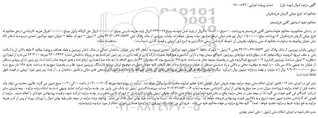 در راستای محکومیت محکوم علیه:اسماعیل آقایی فرزندصفر به پرداخت : 1-مبلغ68/000/000ریال از بابت اصل خواسته ومبلغ2/244/197ریال بابت هزینه دادرسی ومبلغ90/000/000ریال حق الوکاله وکیل ومبلغ5/000/000ریال هزینه کارشناسی درحق محکوم له فرخ حیاتی گرجان فرزندقربان 2- پرداخت مبلغ11/500/000ریال نیم عشر دولتی درحق صندوق دولت وصول خواهد شد. یکباب زیرزمین از ملک پلاک ثبتی 7544-33-43121 بخش 2 اردبیل – شهرک حافظ – خیابان شهید نورالدین احمدی نرسیده به استخر لاله نبش خیابان وباتوجه به درخواست محکوم له مبنی برتوقیف وفروش آن ،توسط کارشناس رسمی دادگستری به شرح ذیل ارزیابی و قیمت گذاری شده است./.                   مشخصات ملک: