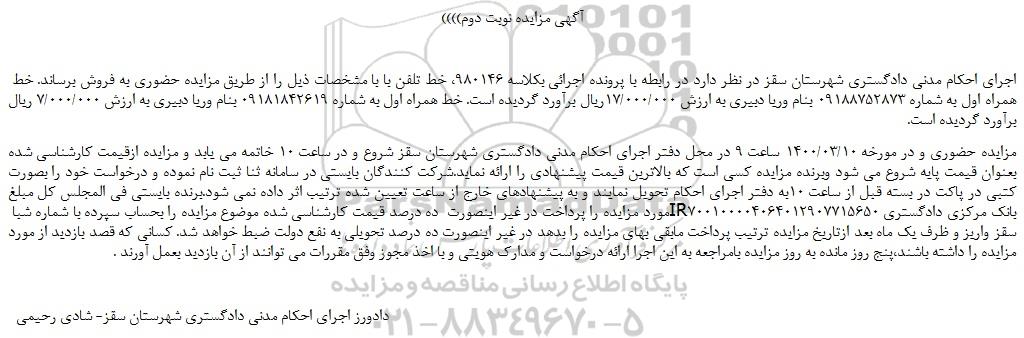 مزایده حضوری و در مورخه 1400/03/10 ساعت 9 در محل دفتر اجرای احکام مدنی دادگستری شهرستان سقز شروع و در ساعت 10 خاتمه می یابد و مزایده ازقیمت کارشناسی شده بعنوان قیمت پایه شروع می شود وبرنده مزایده کسی است که بالاترین قیمت پیشنهادی را ارائه نماید.شرکت کنندگان بایستی در سامانه ثنا ثبت نام نموده و درخواست خود را بصورت کتبی در پاکت در بسته قبل از ساعت 10به دفتر اجرای احکام تحویل نمایند و به پیشنهادهای خارج از ساعت تعیین شده ترتیب اثر داده نمی شود.برنده بایستی فی المجلس کل مبلغ مورد مزایده را پرداخت در غیر اینصورت  ده درصد قیمت کارشناسی شده موضوع مزایده را بحساب سپرده با شماره شبا IR700100004064012907715650 بانک مرکزی دادگستری سقز واریز و ظرف یک ماه بعد ازتاریخ مزایده ترتیب پرداخت مابقی بهای مزایده را بدهد در غیر اینصورت ده درصد تحویلی به نفع دولت ضبط خواهد شد. کسانی که قصد بازدید از مورد مزایده را داشته باشند،پنج روز مانده به روز مزایده بامراجعه به این اجرا ارائه درخواست و مدارک هویتی و با اخذ مجوز وفق مقررات می توانند از آن بازدید بعمل آورند .