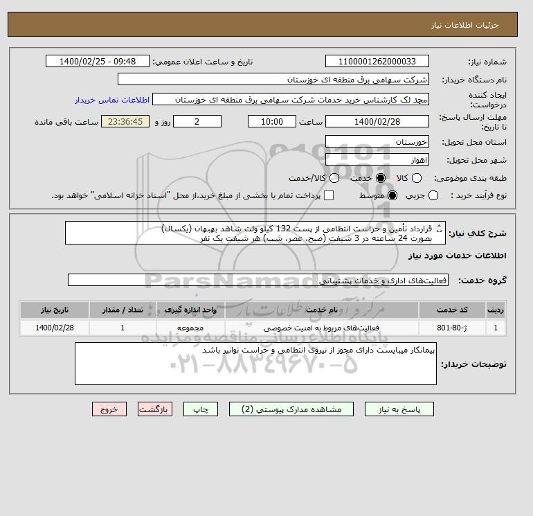 شرح کلی نیاز: قرارداد تأمین و حراست انتظامی از پست 132 کیلو ولت شاهد بهبهان (یکسال)