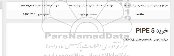 مناقصه خرید pipe 5 از کلیه افراد متخصص و شرکتها واجد شرایط دعوت به عمل میآید در مناقصه با کد خبرگزاری پارس نماد: 3410017 شرکت نمایند.