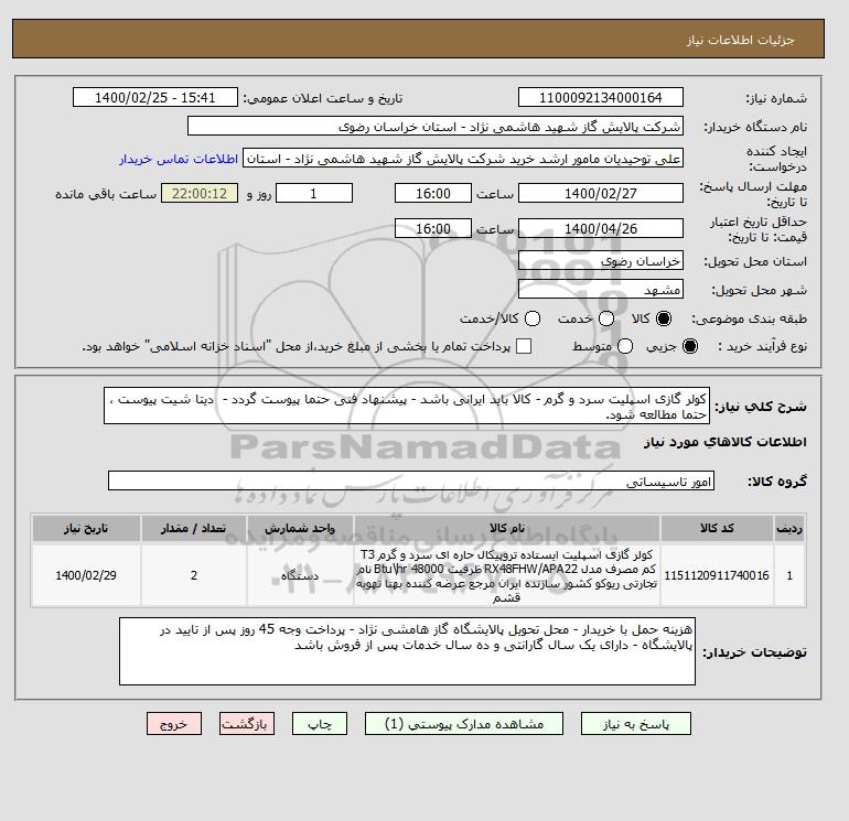 نام دستگاه خریدار:شرکت پالایش گاز شهید هاشمی نژاد - استان خراسان رضوی