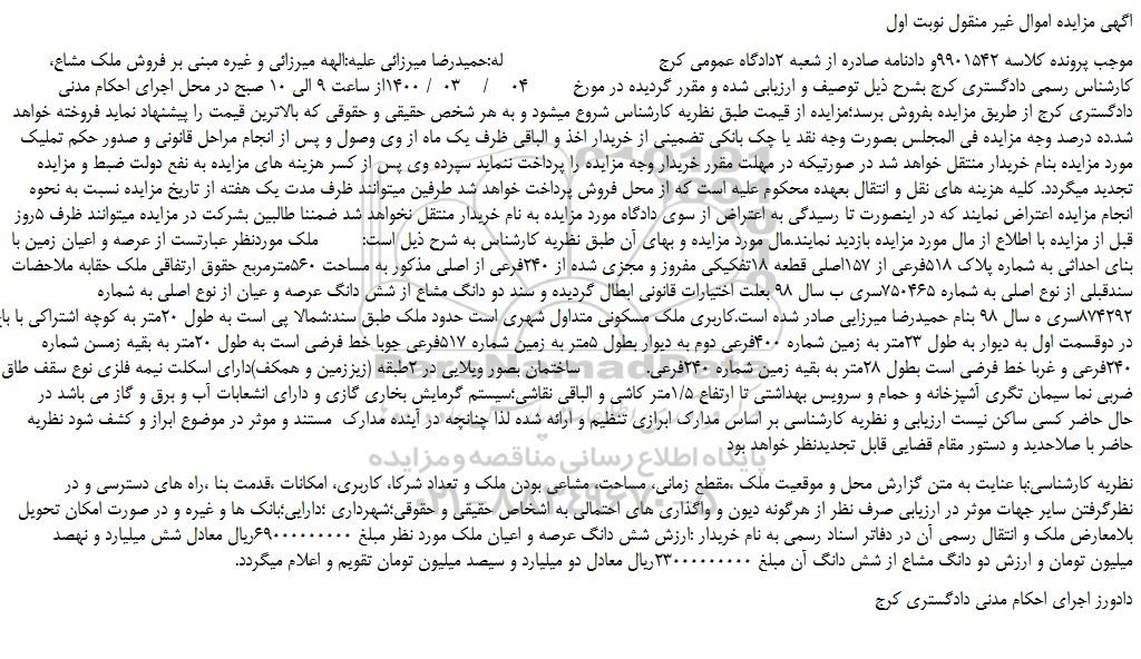 موجب پرونده کلاسه 9901542و دادنامه صادره از شعبه 2دادگاه عمومی کرج                            له:حمیدرضا میرزائی علیه:الهه میرزائی و غیره مبنی بر فروش ملک مشاع، کارشناس رسمی دادگستری کرج بشرح ذیل توصیف و ارزیابی شده و مقرر گردیده در مورخ        04    /    03  / 1400از ساعت 9 الی 10 صبح در محل اجرای احکام مدنی دادگستری کرج از طریق مزایده بفروش برسد؛مزایده از قیمت طبق نظریه کارشناس شروع میشود و به هر شخص حقیقی و حقوقی که بالاترین قیمت را پیشنهاد نماید فروخته خواهد شد.ده درصد وجه مزایده فی المجلس بصورت وجه نقد یا چک بانکی تضمینی از خریدار اخذ و الباقی ظرف یک ماه از وی وصول و پس از انجام مراحل قانونی و صدور حکم تملیک مورد مزایده بنام خریدار منتقل خواهد شد در صورتیکه در مهلت مقرر خریدار وجه مزایده را پرداخت ننماید سپرده وی پس از کسر هزینه های مزایده به نفع دولت ضبط و مزایده تجدید میگردد. کلیه هزینه های نقل و انتقال بعهده محکوم علیه است که از محل فروش پرداخت خواهد شد طرفین میتوانند ظرف مدت یک هفته از تاریخ مزایده نسبت به نحوه انجام مزایده اعتراض نمایند که در اینصورت تا رسیدگی به اعتراض از سوی دادگاه مورد مزایده به نام خریدار منتقل نخواهد شد ضمننا طالبین بشرکت در مزایده میتوانند ظرف 5روز قبل از مزایده با اطلاع از مال مورد مزایده بازدید نمایند.مال مورد مزایده و بهای آن طبق نظریه کارشناس به شرح ذیل است:        ملک موردنظر عبارتست از عرصه و اعیان زمین با بنای احداثی به شماره پلاک 518فرعی از 157اصلی قطعه 18تفکیکی مفروز و مجزی شده از 240فرعی از اصلی مذکور به مساحت 560مترمربع حقوق ارتفاقی ملک حقابه ملاحضات سندقبلی از نوع اصلی به شماره 750465سری ب سال 98 بعلت اختیارات قانونی ابطال گردیده و سند دو دانگ مشاع از شش دانگ عرصه و عیان از نوع اصلی به شماره 874292سری ه سال 98 بنام حمیدرضا میرزایی صادر شده است.کاربری ملک مسکونی متداول شهری است حدود ملک طبق سند:شمالا پی است به طول 20متر به کوچه اشتراکی با باغ شرقا در دوقسمت اول به دیوار به طول 23متر به زمین شماره 400فرعی دوم به دیوار بطول 5متر به زمین شماره 517فرعی جوبا خط فرضی است به طول 20متر به بقیه زمسن شماره 240فرعی و غربا خط فرضی است بطول 28متر به بقیه زمین شماره 240فرعی.            ساختمان بصور ویلایی در 2طبقه (زیززمین و همکف)دارای اسکلت نیمه فلزی نوع سقف طاق ضربی نما سیمان تگری آشپزخانه و حمام و سرویس بهداشتی تا ارتفاع 1/5متر کاشی و الباقی نقاشی؛سیستم گرمایش بخاری گازی و دارای انشعابات آب و برق و گاز می باشد در حال حاضر کسی ساکن نیست ارزیابی و نظریه کارشناسی بر اساس مدارک ابرازی تنظیم و ارائه شده لذا چنانچه در آینده مدارک  مستند و موثر در موضوع ابراز و کشف شود نظریه حاضر با صلاحدید و دستور مقام قضایی قابل تجدیدنظر خواهد بود