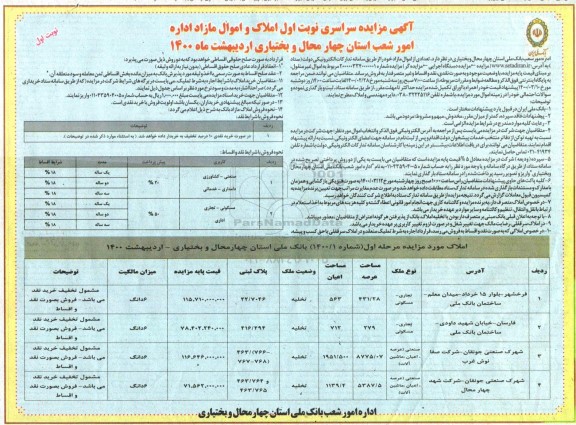 مزایده عمومی مزایده فروش املاک و اموال مازاد مسکونی و تجاری و صنعتی نوبت اول برگزار میگردد. از کلیه افراد متخصص و شرکت‌های واجد شرایط دعوت به عمل می‌آید تا در این مزایده با کد خبرگزاری پارس نماد : 3411057 شرکت نمایند تاریخ شروع مزایده : 1400/02/26 مهلت شرکت در مزایده: تا پایان روز 1400/03/10 مکان برگزاری اموال واگذاری استان‌های چهارمحال و بختیاری و دسته‌بندی‌های مربوط به این حراجی املاک و زمین میباشد.