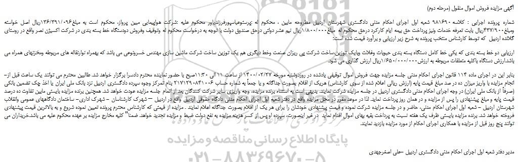 شماره پرونده اجرایی : کلاسه 981690 شعبه اول اجرای احکام مدنی دادگستری شهرستان اردبیل مطروحه مابین ، محکوم له :پرستوعباسپورفرزندیاور محکوم علیه :شرکت هواپیمایی مبین پرواز، محکوم است به مبلغ136/391/096ریال اصل خواسته ومبلغ437/900ریال بابت تعرفه خدمات ونیز پرداخت حق بیمه ایام کارکرد درحق محکوم له مبلغ1/800/000ریال نیم عشر دولتی درحق صندوق دولت با توجه به درخواست محکوم له وتوقیف وفروش دودستگاه خط بسته بندی در شرکت اکسیژن نصر واقع در روستای گلانده اردبیل که توسط کارشناس منتخب پرونده به شرح زیر ارزیابی و برآورد قیمت شده است؛