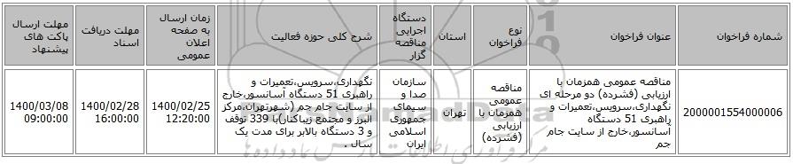 | 2000001554000006 | مناقصه عمومی همزمان با ارزیابی (فشرده) دو مرحله ای نگهداری،سرویس،تعمیرات و راهبری 51 دستگاه آسانسور،خارج از سایت جام جم | مناقصه عمومی همزمان با ارزیابی (فشرده) | تهران | سازمان صدا و سیمای جمهوری اسلامی ایران | نگهداری،سرویس،تعمیرات و راهبری 51 دستگاه آسانسور،خارج از سایت جام جم (شهرتهران،مرکز البرز و مجتمع زیباکنار)با 339 توقف و 3 دستگاه بالابر برای مدت یک سال . | 1400/02/25 12:20:00 | 1400/02/28 16:00:00 | 1400/03/08 09:00:00 |