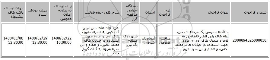 | 2000094526000010 | مناقصه عمومی یک مرحله ای خرید لوله های پلی اتیلن فاضلابی به همراه منهول های آدم رو آماده جهت استفاده در خیابان های معلم، تختی، و همام و ابن سینا مربو | مناقصه عمومی | آذربایجان شرقی | شهرداری منطقه یک تبریز | خرید لوله های پلی اتیلن فاضلابی به همراه منهول های آدم رو آماده جهت استفاده در خیابان های معلم، تختی، و همام و ابن سینا مربوط به قنات کریم خان | 1400/02/22 10:00:00 | 1400/02/29 13:30:00 | 1400/03/08 13:30:00 |