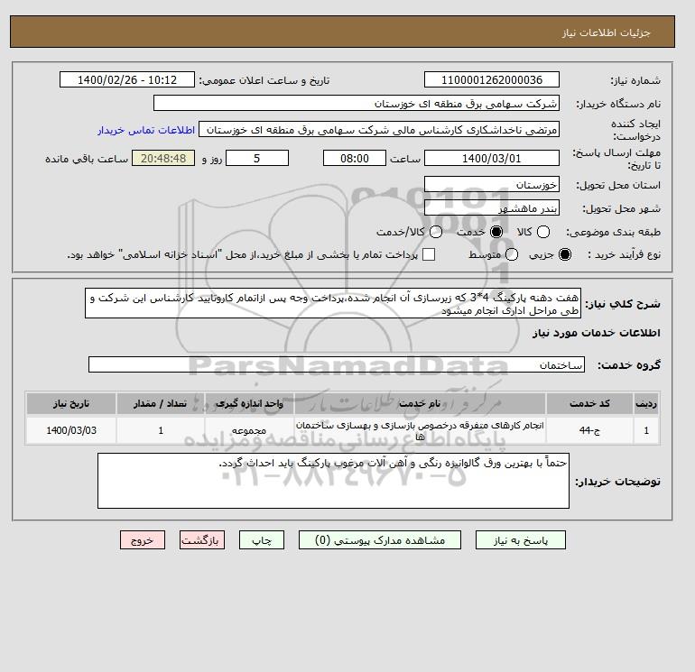شرح کلی نیاز: هفت دهنه پارکینگ 4*3 که زیرسازی آن انجام شده،پرداخت وجه پس ازاتمام کاروتایید کارشناس این شرکت و طی مراحل اداری انجام میشود