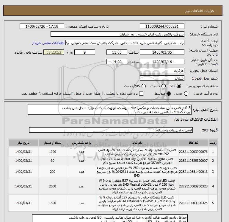 شرح کلی نیاز: 5 قلم لامپ طبق مشخصات و عکس های پیوست. اولویت با لامپ تولید داخل می باشد.