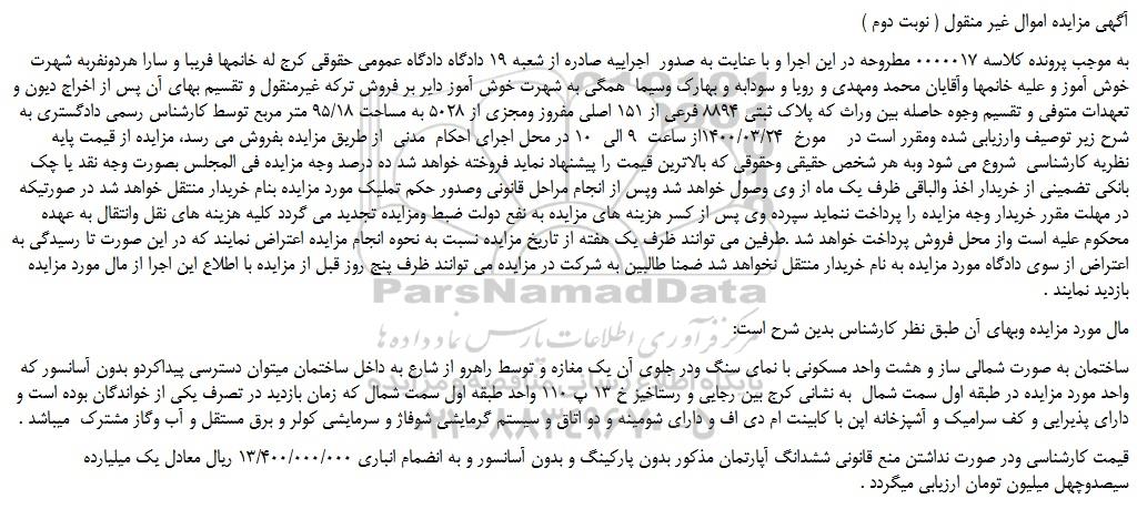 به موجب پرونده کلاسه 0000017 مطروحه در این اجرا و با عنایت به صدور  اجراییه صادره از شعبه 19 دادگاه دادگاه عمومی حقوقی کرج له خانمها فریبا و سارا هردونفربه شهرت خوش آموز و علیه خانمها وآقایان محمد ومهدی و رویا و سودابه و بهارک وسیما  همگی به شهرت خوش آموز دایر بر فروش ترکه غیرمنقول و تقسیم بهای آن پس از اخراج دیون و تعهدات متوفی و تقسیم وجوه حاصله بین وراث که پلاک ثبتی 8894 فرعی از 151 اصلی مفروز ومجزی از 5028 به مساحت 95/18 متر مربع توسط کارشناس رسمی دادگستری به شرح زیر توصیف وارزیابی شده ومقرر است در    مورخ  1400/03/24از ساعت  9 الی  10 در محل اجرای احکام  مدنی  از طریق مزایده بفروش می رسد، مزایده از قیمت پایه    نظریه کارشناسی  شروع می شود وبه هر شخص حقیقی وحقوقی که بالاترین قیمت را پیشنهاد نماید فروخته خواهد شد ده درصد وجه مزایده فی المجلس بصورت وجه نقد یا چک بانکی تضمینی از خریدار اخذ والباقی ظرف یک ماه از وی وصول خواهد شد وپس از انجام مراحل قانونی وصدور حکم تملیک مورد مزایده بنام خریدار منتقل خواهد شد در صورتیکه در مهلت مقرر خریدار وجه مزایده را پرداخت ننماید سپرده وی پس از کسر هزینه های مزایده به نفع دولت ضبط ومزایده تجدید می گردد کلیه هزینه های نقل وانتقال به عهده محکوم علیه است واز محل فروش پرداخت خواهد شد .طرفین می توانند ظرف یک هفته از تاریخ مزایده نسبت به نحوه انجام مزایده اعتراض نمایند که در این صورت تا رسیدگی به اعتراض از سوی دادگاه مورد مزایده به نام خریدار منتقل نخواهد شد ضمنا طالبین به شرکت در مزایده می توانند ظرف پنج روز قبل از مزایده با اطلاع این اجرا از مال مورد مزایده بازدید نمایند .