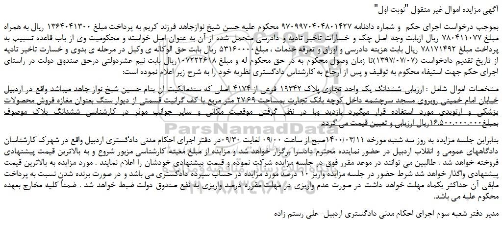 بنابراین جلسه مزایده به روز سه شنبه مورخه 1400/03/11صبح از ساعت 09/00 لغایت 09/30در دفتر اجرای احکام مدنی دادگستری اردبیل واقع در شهرک کارشناسان دادگاههای عمومی و انقلاب اردبیل در حضور نماینده محترم دادسرا برگزار خواهد شد و مزایده از مبلغ معینه کارشناسی مزبور شروع و به بالاترین قیمت پیشنهادی فروخته خواهد شد . طالبین می توانند در موعد مقرر فوق در جلسه مزایده شرکت نموده و قیمت پیشنهادی خودشان را اعلام نمایند . مورد مزایده به بالاترین قیمت پیشنهادی واگذار خواهد شد شرط حضور در جلسه مزایده واریز 10 درصد مورد مزایده در حساب سپرده دادگستری می باشد و در صورت برنده شدن نسبت به پرداخت مابقی آن حداکثر یکماه مهلت خواهد داشت در صورت عدم واریزی در مهلت مقرره درصد واریزی به نفع صندوق دولت ضبط خواهد شد . ضمناً کلیه مخارج بعهده محکوم علیه می باشد.
