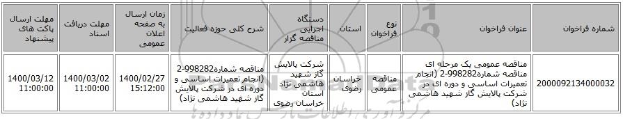 مناقصه، مناقصه عمومی یک مرحله ای مناقصه شماره998282-2 (انجام تعمیرات اساسی و دوره ای در شرکت پالایش گاز شهید هاشمی نژاد) , مناقصه عمومی یک مرحله ای مناقصه شماره998282-2 (انجام تعمیرات اساسی و دوره ای در شرکت پالایش گاز شهید هاشمی نژاد)
