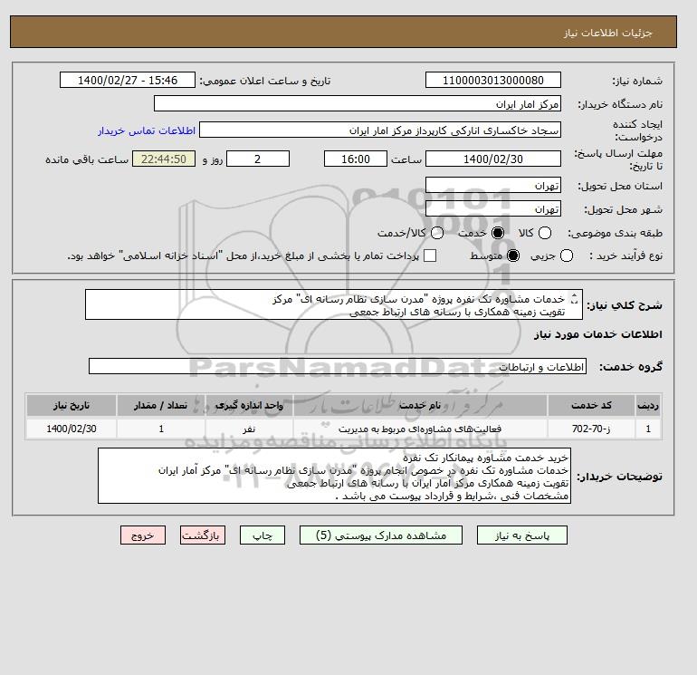 خدمات مشاوره تک نفره در خصوص انجام پروژه "مدرن سازی نظام رسانه ای" مرکز آمار ایران