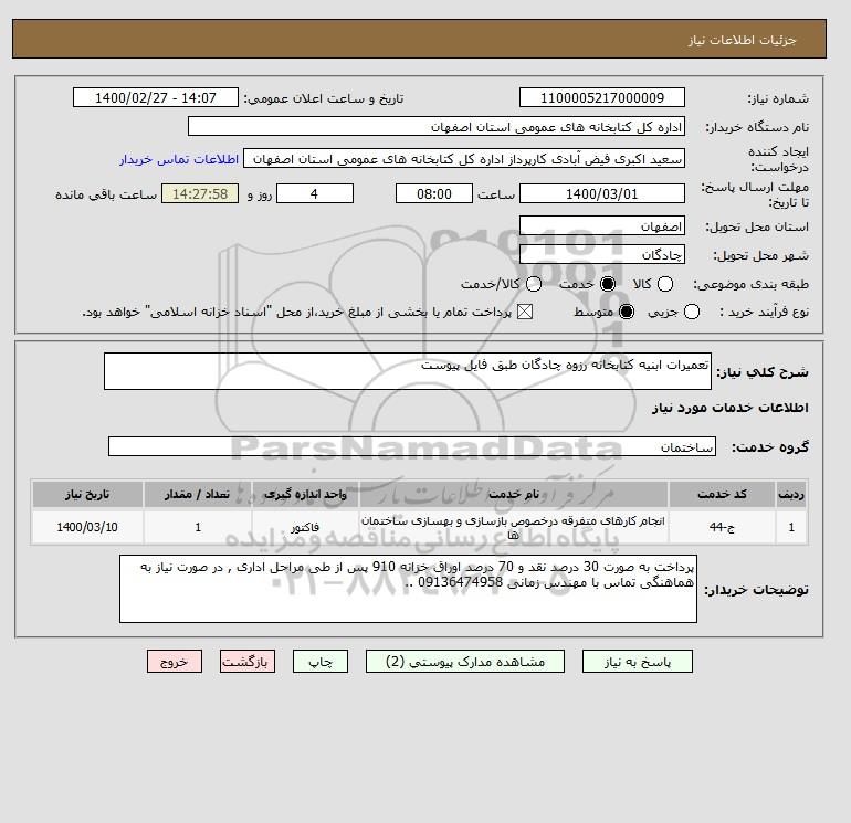 شرح کلی نیاز: تعمیرات ابنیه کتابخانه رزوه چادگان طبق فایل پیوست