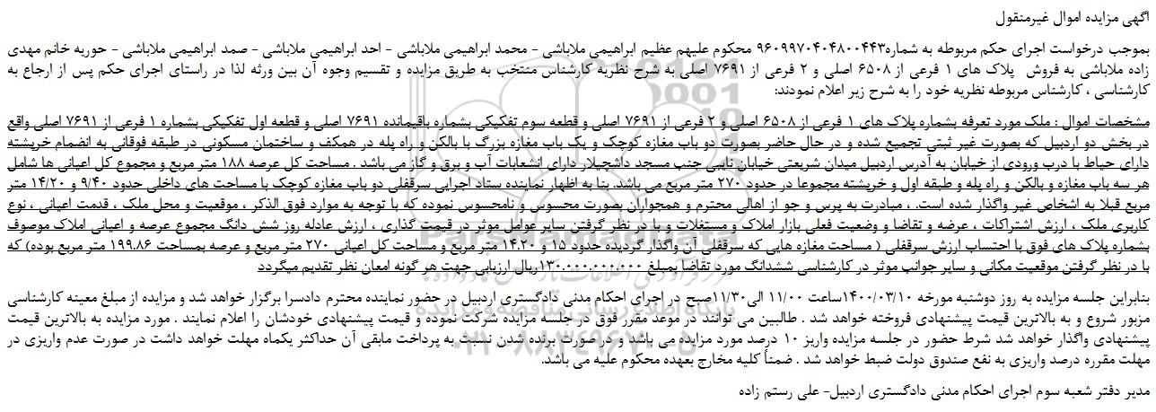 بموجب درخواست اجرای حکم مربوطه به شماره9609970404800443 محکوم علیهم عظیم ابراهیمی ملاباشی - محمد ابراهیمی ملاباشی - احد ابراهیمی ملاباشی - صمد ابراهیمی ملاباشی - حوریه خانم مهدی زاده ملاباشی به فروش پلاک های 1 فرعی از 6508 اصلی و 2 فرعی از 7691 اصلی به شرح نظریه کارشناس منتخب به طریق مزایده و تقسیم وجوه آن بین ورثه لذا در راستای اجرای حکم پس از ارجاع به کارشناسی ، کارشناس مربوطه نظریه خود را به شرح زیر اعلام نمودند: