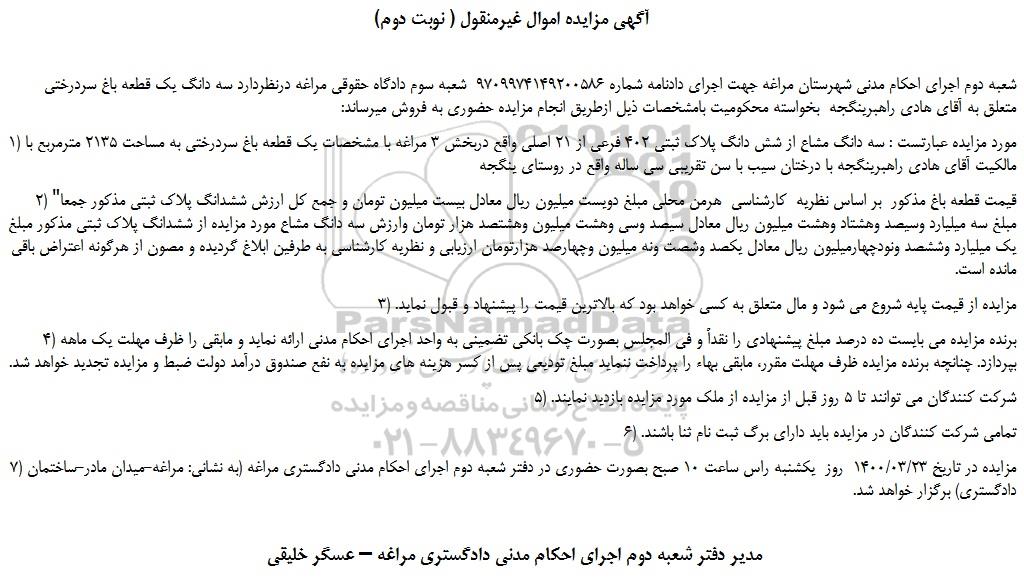 شعبه دوم اجرای احکام مدنی شهرستان مراغه جهت اجرای دادنامه شماره 9709974149200586  شعبه سوم دادگاه حقوقی مراغه درنظردارد سه دانگ یک قطعه باغ سردرختی متعلق به آقای هادی راهبرینگجه  بخواسته محکومیت بامشخصات ذیل ازطریق انجام مزایده حضوری به فروش میرساند: