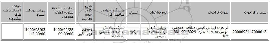 علاقهمندان میتوانند جهت دریافت اسناد و اطلاعات تکمیلی، مناقصه، فراخوان ارزیابی کیفی مناقصه عمومی دو مرحله ای شماره RNL-9948029-MM با سامانه مناقصات و مزایدات ایران پارسنماد داده ها 88349670 تماس حاصل نمایند.