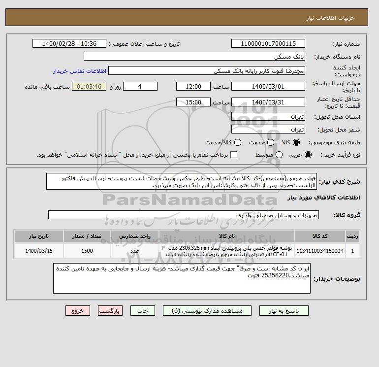 شرح کلی نیاز: فولدر چرمی(مصنوعی)-کد کالا مشابه است- طبق عکس و مشخصات لیست پیوست- ارسال پیش فاکتور الزامیست-خرید پس از تائید فنی کارشناس این بانک صورت میپذیرد.