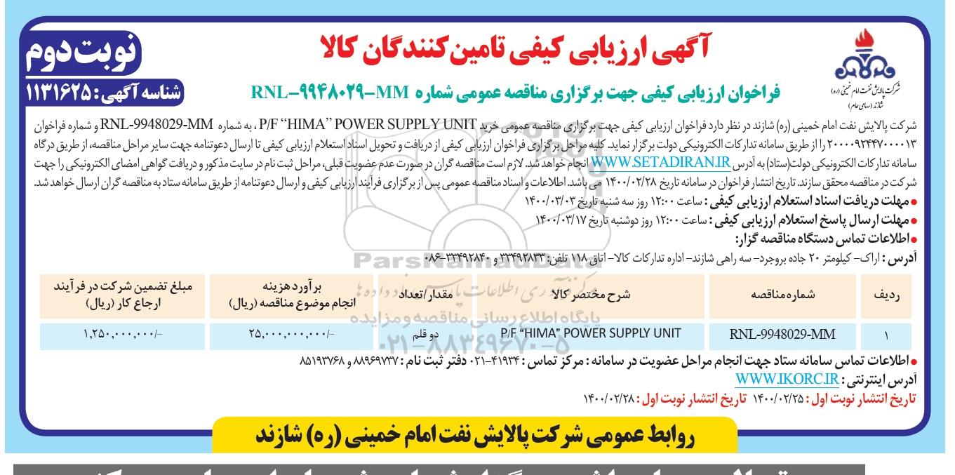 شرکت پالایش نفت امام خمینی (ره) شازند در نظر دارد فراخوان ارزیابی کیفی جهت برگزاری مناقصه عمومی خرید P/F HIMA POWER SUPPLY UNIT به شماره RNL-9948029-MM و شماره فراخوان 2000092447000013 را از طریق سامانه تدارکات الکترونیکی دولت برگزار نماید. کلیه مراحل برگزاری فراخوان ارزیابی کیفی از دریافت و تحویل اسناد استعلام ارزیابی کیفی تا ارسال دعوتنامه جهت سایر مراحل مناقصه از طریق درگاه سامانه تدارکات الکترونیکی دولت ستاد به آدرس ستاد ایران انجام خواهد شد. لازم است مناقصه گران در صورت عدم عضویت قبلی مراحل ثبت نام در سایت مذکور و دریافت گواهی امضای الکترونیکی را جهت شرکت در مناقصه محقق سازند. تاریخ انتشار فراخوان در سامانه تاریخ 400.2.28 می باشد. اطلاعات و اسناد مناقصه عمومی پس از برگزاری فرآیند ارزیابی کیفی و ارسال دعوتنامه از طریق سامانه ستاد به مناقصه گران ارسال خواهد شد.