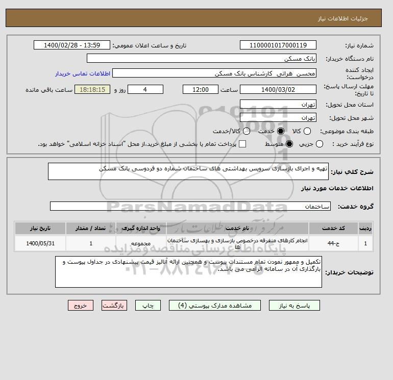 شرح کلی نیاز: تهیه و اجرای بازسازی سرویس بهداشتی های ساختمان شماره دو فردوسی بانک مسکن