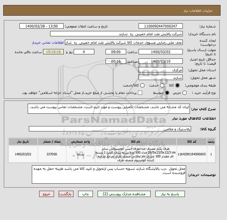توضیحات خریدار:محل تحویل درب پالایشگاه شازند تسویه حساب پس ازتحویل و تایید کالا می باشد هزینه حمل به عهده فروشنده است.