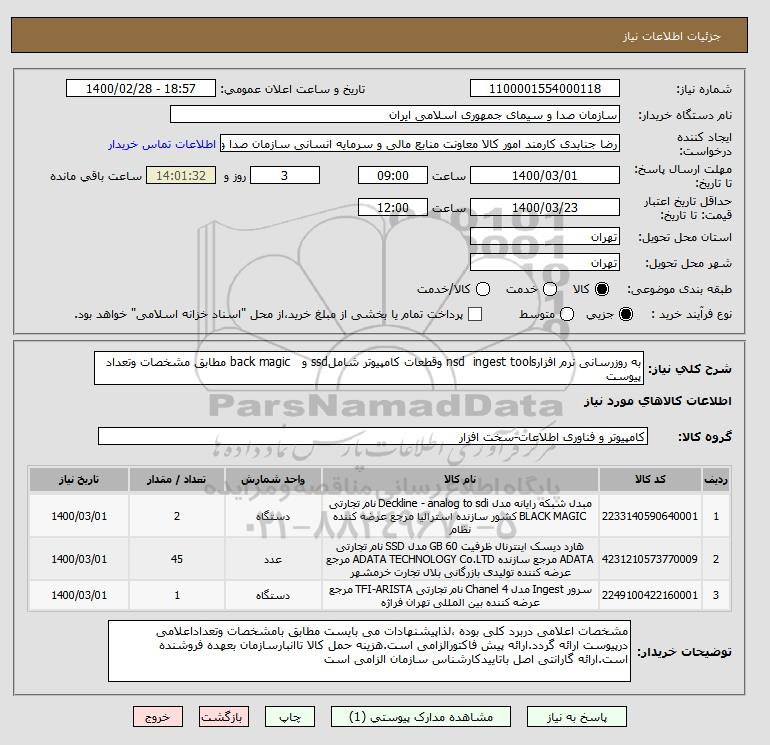 استعلام به روزرسانی نرم افزارnsd ingest tools وقطعات کامپیوتر شاملssd و back magic مطابق مشخصات وتعداد پیوست, استعلام به روزرسانی نرم افزارnsd ingest tools وقطعات کامپیوتر شاملssd و back magic مطابق مشخصات وتعداد پیوست