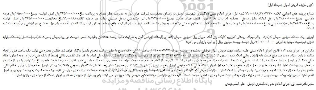 شماره پرونده های اجرایی: کلاسه 9902330و9900188 شعبه اول اجرای احکام مدنی دادگستری شهرستان اردبیل در راستای محکومیت شرکت حران یول به مدیریت جعفر دهبان به پرداخت مبلغ265/000/000ریال اصل خواسته  ومبلغ1/580/000ریال هزینه دادرسی ومبلغ 4/800/000ریال حق الوکاله وکیل درحق  محکوم له: برات بختیارجهان خانملو فرزند هدایت ،ومبلغ3/250/000ریال نیم عشردولتی درحق صندوق دولت ودر پرونده کلاسه9900188مبلغ محکومیت265/000/000ریال اصل خواسته ومبلغ488/2000ریال هزینه دادرسی ومبلغ1/800/0000ریال نیم عشر دولتی  ،باتوجه درخواست محکوم له مبنی برتوقیف  وفروش یک دستگاه سیلوی سیمان کارکرده  واقع درجاده روستای کوراییم کارگاه بتن آماده حیران یول  به شرح زیر ارزیابی و برآورد قیمت شده است؛