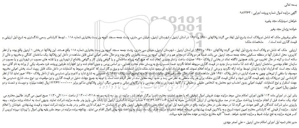 آگهی مزایده اموال شماره پرونده اجرایی : 982464