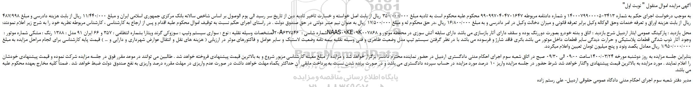 مشخصات وسیله نقلیه : نوع : سواری سیستم وتیپ : سوزوکی گرند ویتارا بشماره انتظامی : 357 و 66 ایران 91 مدل : 1388 رنگ : مشکی شماره موتور : J20A637546 شماره شاسی : NAAS09KE09K007868 محل بازدید : پارکینگ عمومی ایثار اردبیل شرح بازدید : اتاق و بدنه خودرو بصورت دوررنگ بوده و سقف دارای آثار بازسازی می باشد دارای سابقه آتش سوزی در محفظه موتور و وجود آثار ذوب شدگی قطعات پلاستیکی و حرارت دیدگی سایر قطعات داخل موتور می باشد باتری فاقد شارژ و فرسوده می باشد با در نظر گرفتن سیستم تیپ مدل وضعیت ظاهری و فنی وسیله نقلیه بیمه نامه وضعیت لاستیک و سایر عوامل و فاکتورهای موثر در ارزیابی ( هزینه های نقل و انتقال عوارض شهرداری و دارایی و ... ) قیمت پایه کارشناسی برای انجام مراحل مزایده به مبلغ 1/950/000/000 ریال معادل یکصد ونود و پنج میلیون تومان تعیین واعلام میگردد.