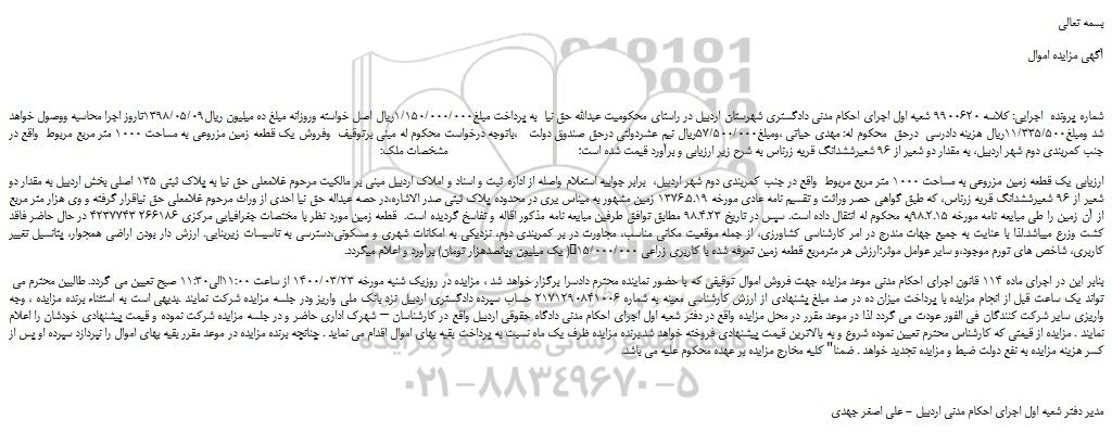شماره پرونده  اجرایی: کلاسه 9900620 شعبه اول اجرای احکام مدنی دادگستری شهرستان اردبیل در راستای محکومیت عبدالله حق نیا  به پرداخت مبلغ1/150/000/000ریال اصل خواسته وروزانه مبلغ ده میلیون ریال1398/05/09تاروز اجرا محاسبه ووصول خواهد شد ومبلغ11/335/500ریال هزینه دادرسی  درحق  محکوم له: مهدی حیاتی ،ومبلغ57/500/000ریال نیم عشردولتی درحق صندوق دولت   ،باتوجه درخواست محکوم له مبنی برتوقیف  وفروش یک قطعه زمین مزروعی به مساحت 1000 متر مربع مربوط  واقع در جنب کمربندی دوم شهر اردبیل، به مقدار دو شعیر از 96 شعیرششدانگ قریه زرناس به شرح زیر ارزیابی و برآورد قیمت شده است؛                                        مشخصات ملک: