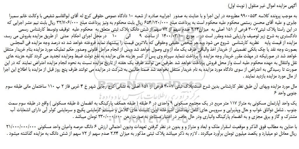 به موجب پرونده کلاسه 9900553 مطروحه در این اجرا و با عنایت به صدور اجراییه صادره از شعبه 10 دادگاه عمومی حقوقی کرج له آقای ابوالقاسم شفیعی با وکالت خانم سمیرا جابری و علیه آقای محسن رستمی محکوم علیه محکوم است به پرداخت مبلغ 654/120/000 ریال بابت محکوم به ونیز پرداخت مبلغ 32/706/000 ریال بابت نیم عشر اجرایی که در این راستا پلاک ثبتی3007 فرعی از 151 اصلی به میزان2.24 صدم سهم از 72 سهم از شش دانگ پلاک ثبتی متعلق به محکوم علیه توقیف وتوسط کارشناس رسمی دادگستری به شرح زیر توصیف وارزیابی شده ومقرر است در مورخ 1400/03/10 از ساعت 9 الی 10 در محل اجرای احکام مدنی از طریق مزایده بفروش می رسد، مزایده از قیمت پایه نظریه کارشناسی شروع می شود وبه هر شخص حقیقی وحقوقی که بالاترین قیمت را پیشنهاد نماید فروخته خواهد شد ده درصد وجه مزایده فی المجلس بصورت وجه نقد یا چک بانکی تضمینی از خریدار اخذ والباقی ظرف یک ماه از وی وصول خواهد شد وپس از انجام مراحل قانونی وصدور حکم تملیک مورد مزایده بنام خریدار منتقل خواهد شد در صورتیکه در مهلت مقرر خریدار وجه مزایده را پرداخت ننماید سپرده وی پس از کسر هزینه های مزایده به نفع دولت ضبط ومزایده تجدید می گردد کلیه هزینه های نقل وانتقال به عهده محکوم علیه است واز محل فروش پرداخت خواهد شد .طرفین می توانند ظرف یک هفته از تاریخ مزایده نسبت به نحوه انجام مزایده اعتراض نمایند که در این صورت تا رسیدگی به اعتراض از سوی دادگاه مورد مزایده به نام خریدار منتقل نخواهد شد ضمنا طالبین به شرکت در مزایده می توانند ظرف پنج روز قبل از مزایده با اطلاع این اجرا از مال مورد مزایده بازدید نمایند .