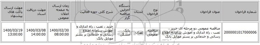 2000001017000006 | مناقصه عمومی دو مرحله ای خرید ، نصب ، راه اندازی و آموزش سامانه اطلاع رسانی و خدماتی بر بستر موبایل بانک | مناقصه عمومی | تهران | بانک مسکن | خرید ، نصب ، راه اندازی و آموزش سامانه اطلاع رسانی و خدماتی بر بستر موبایل بانک | 1400/02/30 08:00:00 | 1400/03/08 14:00:00 | 1400/03/19 13:00:00 |