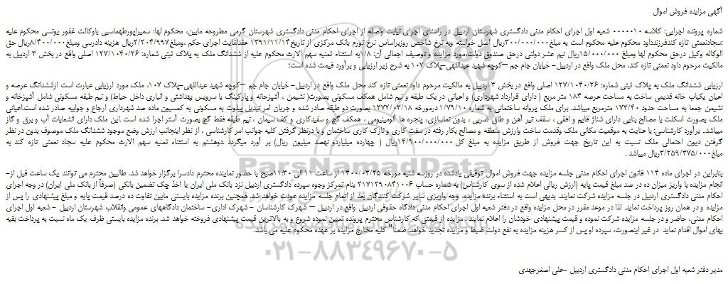 شماره پرونده اجرایی: کلاسه 0000010 شعبه اول اجرای احکام مدنی دادگستری شهرستان اردبیل در راستای اجرای نیابت واصله از اجرای احکام مدنی دادگستری شهرستان گرمی مطروحه مابین، محکوم لها: سمیراپورطهماسبی باوکالت غفور یونسی محکوم علیه :سجادنعمتی تازه کندفرزندداود محکوم علیه محکوم است به مبلغ300/000/000ریال اصل خواسته وبه نرخ شاخص روزبراساس نرخ تورم بانک مرکزی از تاریخ1391/11/14 عقدلغایت اجرای حکم ،ومبلغ2/204/997ریال هزینه دادرسی ومبلغ8/400/000ریال حق الوکاله وکیل درحق محکوم لها ومبلغ 15/000/000ریال نیم عشر دولتی درحق صندوق دولت،مورد مزایده و توصیف اجمالی آن: 1/8به استثناء ثمنیه سهم الارث محکوم علیه از ششدانگ ملک به پلاک ثبتی شماره: 127/1040/26 اصلی واقع در بخش 3 اردبیل به مالکیت مرحوم داود نعمتی تازه کند، محل ملک واقع در اردبیل- خیابان جام جم –کوچه شهید عبداللهی-پلاک 107 به شرح زیر ارزیابی و برآورد قیمت شده است؛
