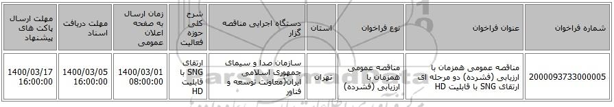 | 2000093733000005 | مناقصه عمومی همزمان با ارزیابی (فشرده) دو مرحله ای ارتقای SNG با قابلیت HD | مناقصه عمومی همزمان با ارزیابی (فشرده) | تهران | سازمان صدا و سیمای جمهوری اسلامی ایران(معاونت توسعه و فناور | ارتقای SNG با قابلیت HD | 1400/03/01 08:00:00 | 1400/03/05 16:00:00 | 1400/03/17 16:00:00 |