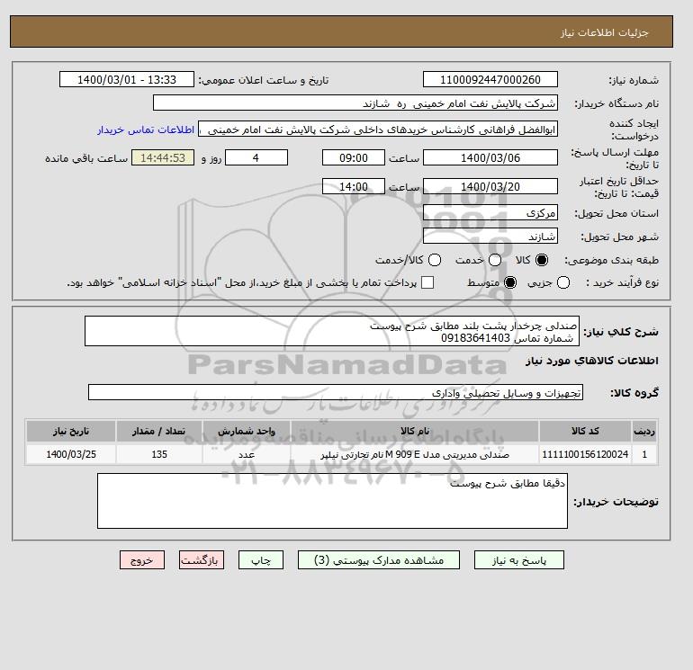 شرح کلی نیاز: صندلی چرخدار پشت بلند مطابق شرح پیوست شماره تماس 09183641403