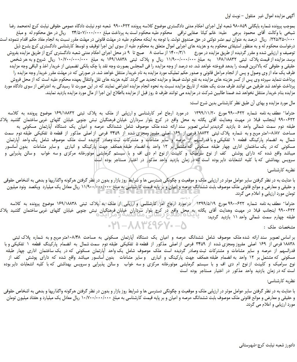 بموجب پرونده شماره بایگانی 980859 شعبه اول اجرای احکام مدنی دادگستری موضوع کلاسه پرونده 9900622 شعبه دوم نیابت دادگاه عمومی حقوقی نیابت کرج له:محمد رضا شیخی با وکالت آقای محمود برجی علیه: خانم کیانا صفایی نراقی محکوم علیه محکوم است به پرداخت مبلغ 24/507/000/000 ریال در حق محکوم له و مبلغ 225/350/000/ ریال درصد به عنوان نیم عشر دولتی در حق صندوق دولت. با توجه به اینکه محکوم علیه در مهلت قانونی در مهلت مقرر نسبت به انجام مفاد حکم اقدام ننموده است بنا به درخواست محکوم له و به منظور استیفای محکوم به و هزینه های اجرایی اموال متعلق به محکوم علیه از سوی این اجرا توقیف و توسط کارشناسی دادگستری کرج بشرح ذیل توصیف و ارزیابی شده و مقرر گردیده از طریق مزایده در مورخ 1400/3/1 از ساعت 8 صبح تا 9 در محل اجرای احکام مدنی شعبه دادگستری کرج از طریق مزایده بفروش برسد. مزایده از قیمت پلاک ثبتی 168/18832 به مبلغ 11/900/000/000 ریال و پلاک ثبتی 169/18838 به مبلغ 10/700/000/000 ریال شروع و به هر شخص حقیقی و حقوقی که بالاترین قیمت را بدهد فروخته خواهد شد. ده درصد از وجه مزایده را فی المجلس بصورت وجه نقد یا چک بانکی تضمینی از خریدار اخذ و الباقی وجه مزایده ظرف یک ماه از وی وصول و پس از انجام مراحل قانونی و صدور حکم تملیک مورد مزایده به نام خریدار منتقل خواهد شد. در صورتی که در مهلت مقرر خریدار وجه مزایده را پرداخت ننماید سپرده وی پس از کسر هزینه های مزایده به نفع دولت ضبط و مزایده تجدید می گردد. کلیه هزینه های نقل وانتقال بعهده محکوم علیه است که از محل فروش پرداخت خواهد شد طرفین می توانند ظرف مدت یک هفته از تاریخ مزایده نسبت به نحوه انجام مزایده اعتراض نمایند که در این صورت تا رسیدگی به اعتراض از سوی دادگاه مورد مزایده بنام خریدار منتقل نخواهد شد ضمنا طالبین شرکت در مزایده می توانند ظرف 5 روز قبل از مزایده بااطلاع این اجرا از مال مورد مزایده بازدید نمایند.