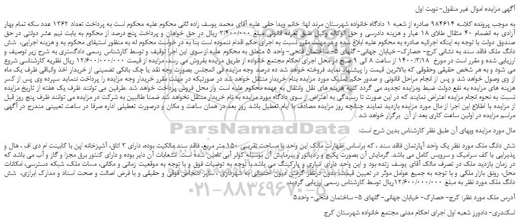 به موجب پرونده کلاسه 984614 صادره از شعبه 1 دادگاه خانواده شهرستان مرند لها: خانم ویدا حقی علیه آقای محمد یوسف زاده ثانی محکوم علیه محکوم است به پرداخت تعداد 1362 عدد سکه تمام بهار آزادی به انضمام 40 مثقال طلای 18 عیار و هزینه دادرسی و حق الوکاله وکیل طبق تعرفه قانونی مبلغ 2/400/000 ریال در حق خواهان و پرداخت پنج درصد از محکوم به بابت نیم عشر دولتی در حق صندوق دولت با توجه به اینکه اجرائیه صادره به محکوم علیه ابلاغ شده و در مهلت مقرر نسبت به اجرای حکم اقدام ننموده است بنا به در خواست محکوم له به منظور استیفای محکوم به و هزینه اجرایی، شش دانگ ملک فاقد سند به نشانی کرج- حصارک- خیابان جهانی- گلهای 5- ساختمان فتحی- واحد 5 متعلق به محکوم علیه از سوی این اجرا توقیف و توسط کارشناس رسمی دادگستری به شرح زیر توصیف و ارزیابی شده و مقرر است در مورخ 1400/3/18 از ساعت 8 الی 9 صبح در محل اجرای احکام مجتمع خانواده از طریق مزایده بفروش می رسد، مزایده از قیمت 12/600/000/000 ریال نظریه کارشناسی شروع می شود و به هر شخص حقیقی وحقوقی که بالاترین قیمت را پیشنهاد نماید فروخته خواهد شد ده درصد وجه مزایده فی المجلس بصورت وجه نقد یا چک بانکی تضمینی از خریدار اخذ والباقی ظرف یک ماه از وی وصول خواهد شد و پس از انجام مراحل قانونی و صدور حکم تملیک مورد مزایده بنام خریدار منتقل خواهد شد در صورتیکه در مهلت مقرر خریدار وجه مزایده را پرداخت ننماید سپرده وی پس از کسر هزینه های مزایده به نفع دولت ضبط ومزایده تجدید می گردد کلیه هزینه های نقل وانتقال به عهده محکوم علیه است واز محل فروش پرداخت خواهد شد .طرفین می توانند ظرف یک هفته از تاریخ مزایده نسبت به نحوه انجام مزایده اعتراض نمایند که در این صورت تا رسیدگی به اعتراض از سوی دادگاه مورد مزایده به نام خریدار منتقل نخواهد شد ضمنا طالبین به شرکت در مزایده می توانند ظرف پنج روز قبل از مزایده با اطلاع این اجرا از مال مورد مزایده بازدید نمایند چنانچه روز مزایده مصادف با ایام تعطیل باشد روز بعد در همان ساعت و مکان و درصورت تعطیلی اداره صرفا در ساعت تعیینی مندرج در آگهی مراسم مزایده در اولین ساعت کاری بعد از آن برگزار خواهد شد .