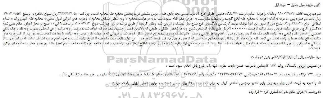 بموجب پرونده کلاسه 9900438/9 و دادنامه واجراییه صادره از شعبه 23 دادگاه عمومی حقوقی کرج له: مریم سمیعی مجد آبادی علیه : یونس سلیمانی فرزند پنجعلی محکوم علیه محکوم است به پرداخت 343/617/050 ریال بعنوان محکوم به و مبلغ 17/130/852 ریال بابت نیم عشر دولتی . با توجه به اینکه اجراییه به محکوم علیه ابلاغ گردیده و در مهلت مقررنسبت به اجرای حکم اقدام ننموده است بنا به درخواست محکوم له و به منظور استیفای محکوم به و هزینه های اجرایی اموال متعلق به محکوم علیه خودرو پراید به شماره انتظامی ایران 21-381 و 84 بشرح ذیل از سوی این اجرا توقیف توسط کارشناسی دادگستری کرج بشرح ذیل توصیف و ارزیابی شده و مقرر گردیده از طریق مزایده در روز چهارشنبه مورخ 1400/3/12 از ساعت 9 الی 10 صبح در محل اجرای احکام مدنی شعبه دادگستری کرج از طریق مزایده بفروش برسد. مزایده از قیمت 620/000/000ریال طبق نظریه کارشناس شروع و به هر شخص حقیقی و حقوقی که بالاترین قیمت را پیشنهاد بدهد فروخته خواهد شد. ده درصد از وجه مزایده را فی المجلس بصورت وجه نقد یا چک بانکی تضمینی از خریدار اخذ و الباقی وجه مزایده ظرف یک ماه از وی وصول و پس از انجام مراحل قانونی و صدور حکم تملیک مورد مزایده به نام خریدار منتقل خواهد شد. در صورتی که در مهلت مقرر خریدار وجه مزایده را پرداخت ننماید سپرده وی پس از کسر هزینه های مزایده به نفع دولت ضبط و مزایده تجدید می گردد. کلیه هزینه های نقل وانتقال بعهده محکوم علیه است که از محل فروش پرداخت خواهد شد طرفین می توانند ظرف مدت یک هفته از تاریخ مزایده نسبت به نحوه انجام مزایده اعتراض نمایند که در این صورت تا رسیدگی به اعتراض از سوی دادگاه مورد مزایده بنام خریدار منتقل نخواهد شد ضمنا طالبین شرکت در مزایده می توانند ظرف 5 روز قبل از مزایده بااطلاع از مال مورد مزایده بازدید نمایند.چنانجه روز مزایده مصادف با ایام تعطیل باشد روز بعددر همان ساعت و مکان برگزار خواهد شد