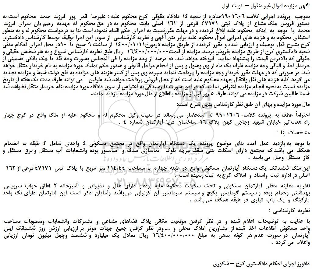 بموجب  پرونده اجرایی کلاسه 9901606صادره از شعبه 14 دادگاه حقوقی  کرج محکوم علیه : علیرضا  قمر  پور  فرزند  صمد  محکوم است به دستور  فروش  ملک مشاع  از  پلاک  ثبتی  47171  فرعی  از  162  اصلی  بابت  محکوم  به در  حق محکوم  له  مهدیه  رحیم یان  سرای  فرزند  محمد  با  توجه  به  اینکه  محکوم علیه ابلاغ گردیده و در مهلت مقررنسبت به اجرای حکم اقدام ننموده است بنا به درخواست محکوم له و به منظور استیفای محکوم به و هزینه های اجرایی اموال محکوم علیه برابر متن آگهی و نظریه کارشناسی  از سوی این اجرا توقیف توسط کارشناس دادگستری کرج بشرح ذیل توصیف و ارزیابی شده و مقرر گردیده از طریق مزایده درمورخ1400/03/11 از ساعت 9 صبح تا  10در محل اجرای احکام مدنی شعبه دادگستری کرج از طریق مزایده بفروش برسد. مزایده از قیمت16/400/000/000  ریال طبق نظریه کارشناس شروع و به هر شخص حقیقی و حقوقی که بالاترین قیمت را پیشنهاد نمایید  فروخته خواهد شد. ده درصد از وجه مزایده را فی المجلس بصورت وجه نقد یا چک بانکی تضمینی از خریدار اخذ و الباقی وجه مزایده ظرف یک ماه از وی وصول و پس از انجام مراحل قانونی و صدور حکم تملیک مورد مزایده به نام خریدار منتقل خواهد شد. در صورتی که در مهلت مقرر خریدار وجه مزایده را پرداخت ننماید سپرده وی پس از کسر هزینه های مزایده به نفع دولت ضبط و مزایده تجدید می گردد. کلیه هزینه های نقل وانتقال بعهده محکوم علیه است که از محل فروش پرداخت خواهد شد طرفین    می توانند ظرف مدت یک هفته از تاریخ مزایده نسبت به نحوه انجام مزایده اعتراض نمایند که در این صورت تا رسیدگی به اعتراض از سوی دادگاه مورد مزایده بنام خریدار منتقل نخواهد شد ضمنا طالبین شرکت در مزایده می توانند ظرف 5 روز قبل از مزایده بااطلاع از مال مورد مزایده بازدید نمایند.