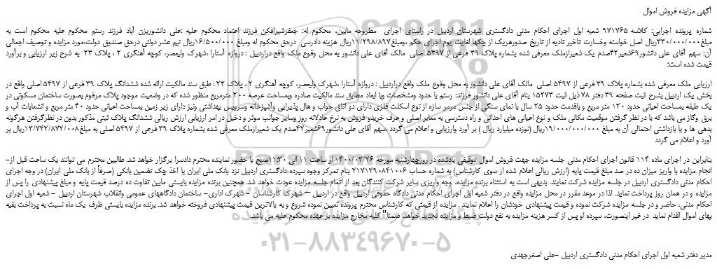 شماره پرونده اجرایی: کلاسه 971765 شعبه اول اجرای احکام مدنی دادگستری شهرستان اردبیل در راستای اجرای  مطروحه مابین، محکوم له: جعفرشیرافکن فرزند اعتماد محکوم علیه :علی دانشوریزن آباد فرزند رستم محکوم علیه محکوم است به مبلغ330/000/000ریال اصل خواسته وخسارت تاخیر تادیه از تاریخ صدورهریک از چکها لغایت یوم اجرای حکم ،ومبلغ11/298/897ریال هزینه دادرسی  درحق محکوم له ومبلغ 16/500/000ریال نیم عشر دولتی درحق صندوق دولت،مورد مزایده و توصیف اجمالی آن: سهم آقای علی دانشور69شعیر42صدم یک شعیرازملک معرفی شده بشماره پلاک 39 فرعی از 5497 اصلی  مالک آقای علی دانشور به محل وقوع ملک واقع دراردبیل : دروازه آستارا ،شهرک ولیعصر، کوچه آهنگری 2 ، پلاک 23  به شرح زیر ارزیابی و برآورد قیمت شده است؛
