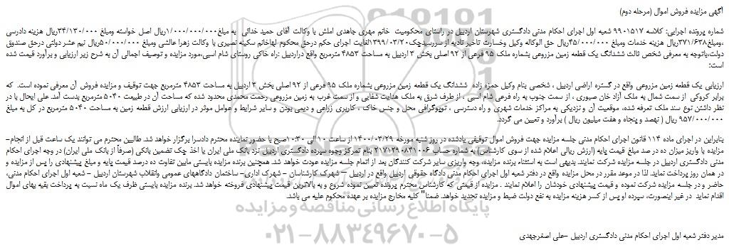 شماره پرونده اجرایی: کلاسه 9901517 شعبه اول اجرای احکام مدنی دادگستری شهرستان اردبیل در راستای محکومیت خانم مهری جاهدی املش با وکالت آقای حمید خدائی به مبلغ1/000/000/000ریال اصل خواسته ومبلغ 34/130/000ریال هزینه دادرسی ،ومبلغ371/638ریال هزینه خدمات ومبلغ 45/000/000ریال حق الوکاله وکیل وخسارت تاخیر تادیه از سررسیدچک1399/03/20لغایت اجرای حکم درحق محکوم لهاخانم سکینه نصیری با وکالت زهرا عالشی ومبلغ 50/000/000ریال نیم عشر دولتی درحق صندوق دولت،باتوجه به معرفی شخص ثالث ششدانگ یک قطعه زمین مزروعی بشماره ملک 95 فرعی از 92 اصلی بخش 3 اردبیل به مساحت 4853 مترمربع واقع دراردبیل :راه خاکی روستای شام اسبی،مورد مزایده و توصیف اجمالی آن به شرح زیر ارزیابی و برآورد قیمت شده است؛