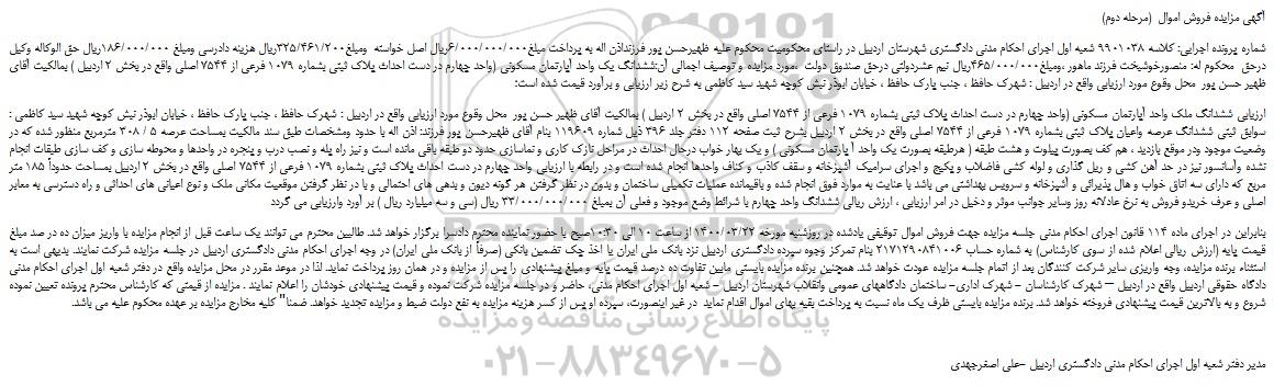 شماره پرونده اجرایی: کلاسه 9901038 شعبه اول اجرای احکام مدنی دادگستری شهرستان اردبیل در راستای محکومیت محکوم علیه ظهیرحسن پور فرزنداذن اله به پرداخت مبلغ6/000/000/000ریال اصل خواسته ومبلغ325/461/200ریال هزینه دادرسی ومبلغ 186/000/000ریال حق الوکاله وکیل درحق محکوم له: منصورخوشبخت فرزند ماهور ،ومبلغ465/000/000ریال نیم عشردولتی درحق صندوق دولت ،مورد مزایده و توصیف اجمالی آن:ششدانگ یک واحد آپارتمان مسکونی (واحد چهارم در دست احداث پلاک ثبتی بشماره 1079 فرعی از 7544 اصلی واقع در بخش 2 اردبیل ) بمالکیت آقای ظهیر حسن پور محل وقوع مورد ارزیابی واقع در اردبیل : شهرک حافظ ، جنب پارک حافظ ، خیابان ابوذر نبش کوچه شهید سید کاظمی به شرح زیر ارزیابی و برآورد قیمت شده است؛