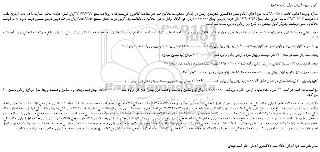 شعبه صادر کننده:شعبه دوم اجرای احکام مدنی دادگستری شهرستان اردبیل/قدیم