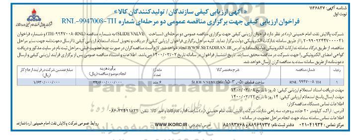 فراخوان ارزیابی ساخت SLIDE VALVE, فراخوان ارزیابی ساخت SLIDE VALVE