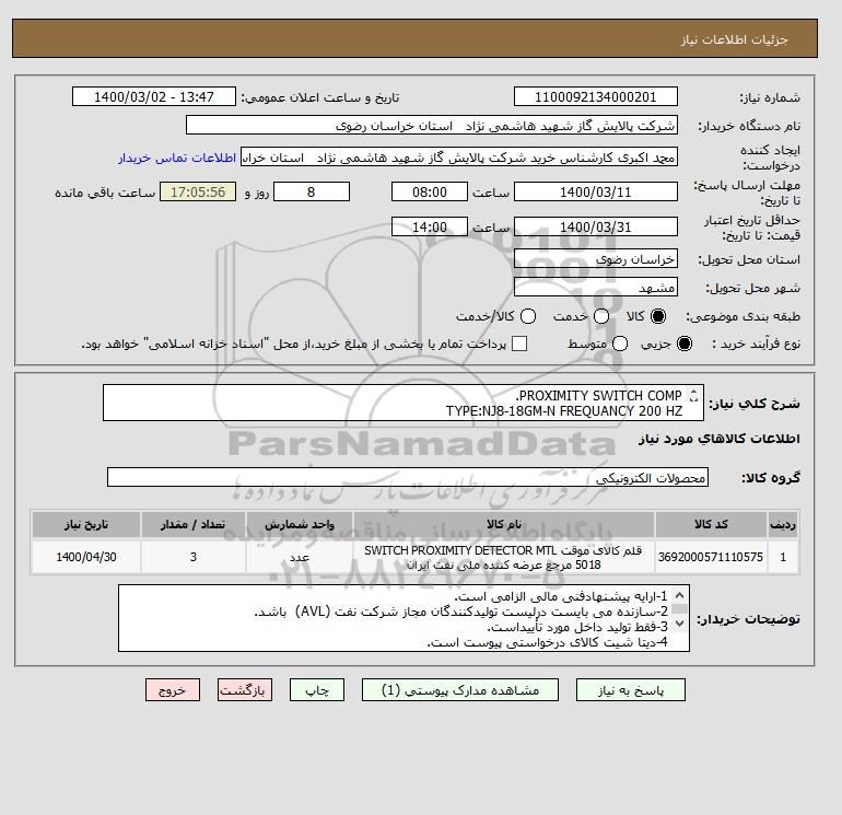 استعلام PROXIMITY SWITCH COMP. TYPE:NJ8-18GM-N FREQUANCY 200 HZ RATED OPRATION DISTANCE:8MM طبق مشخصات برگ پیوست , استعلام PROXIMITY SWITCH COMP. TYPE:NJ8-18GM-N FREQUANCY 200 HZ RATED OPRATION DISTANCE:8MM طبق مشخصات برگ پیوست