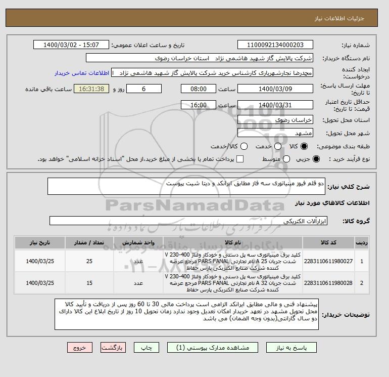 نام دستگاه خریدار:شرکت پالایش گاز شهید هاشمی نژاد استان خراسان رضوی