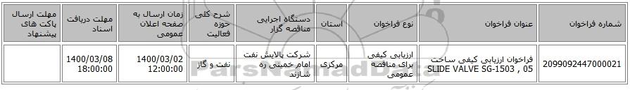 مناقصه، فراخوان ارزیابی کیفی ساخت SLIDE VALVE SG-1503 , 05 از کلیه افراد متخصص و شرکتها واجد شرایط دعوت به عمل میآید در مناقصه با کد خبرگزاری پارس نماد: 3437213 شرکت نمایند.