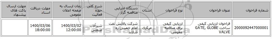 | 2000092447000001 | فراخوان ارزیابی کیفی ساخت GATE, GLOBE VALVE | ارزیابی کیفی برای مناقصه عمومی | مرکزی | شرکت پالایش نفت امام خمینی ره شازند | شیرآلات صنعتی | 1400/03/02 12:00:00 | 1400/03/06 18:00:00 |