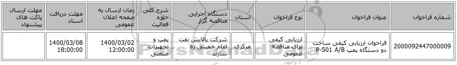 مناقصه، فراخوان ارزیابی کیفی ساخت دو دستگاه پمپ P-501 A/B, فراخوان ارزیابی کیفی ساخت دو دستگاه پمپ P-501 A/B